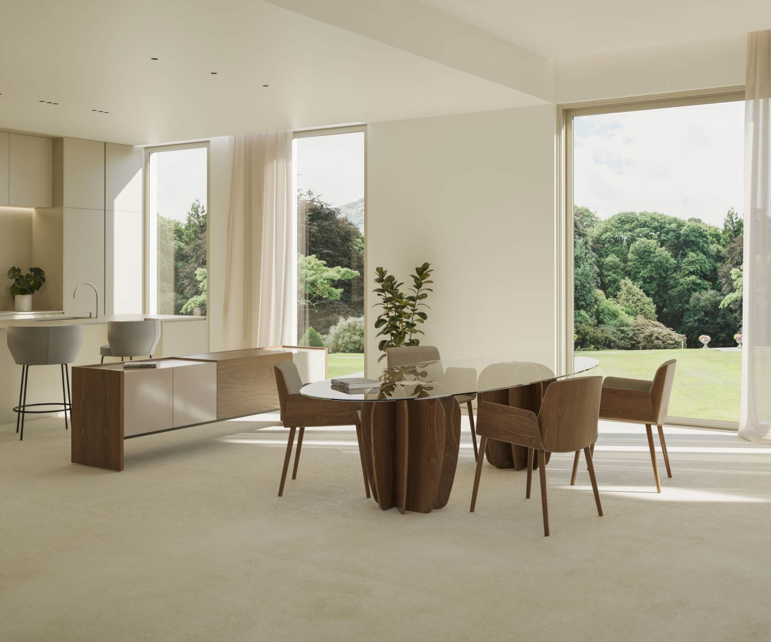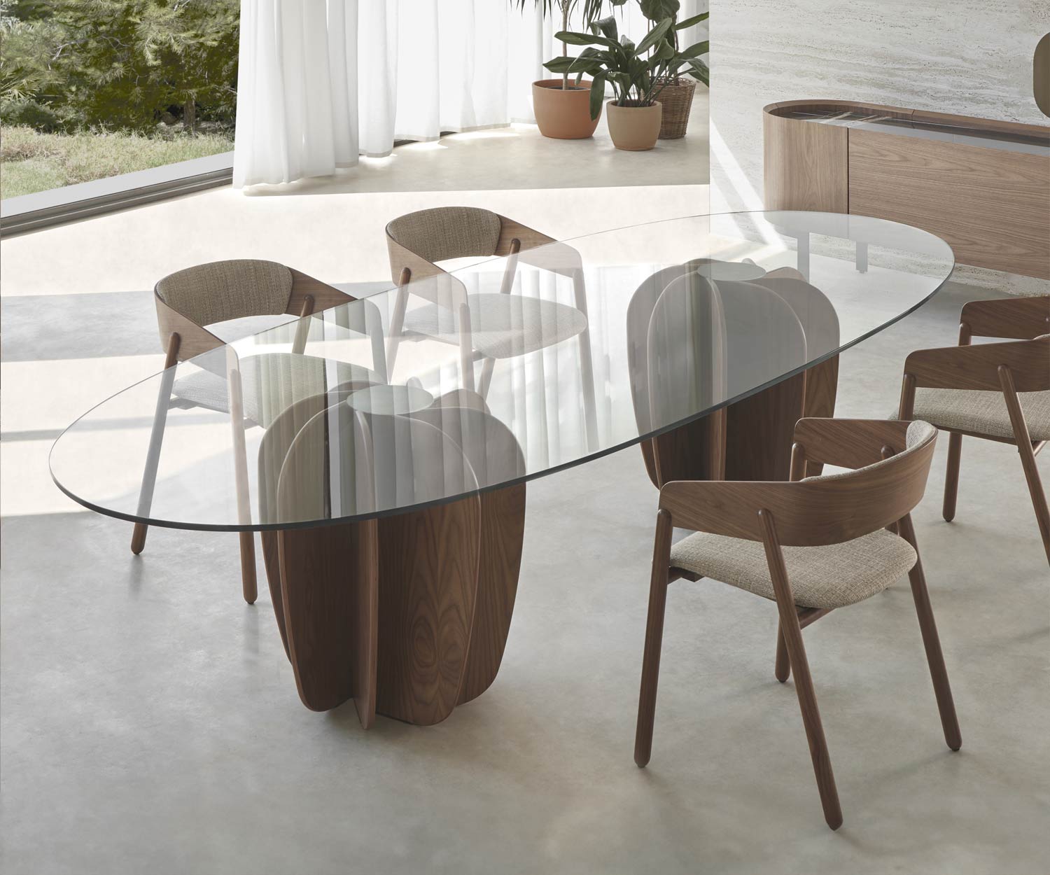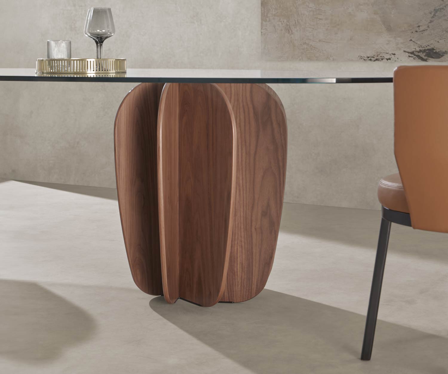 Der Coral Designer Esstisch von Punt ist mit dem Tischbein im natürlichem Teak Holz erhältlich. Die Tischplatte ist im transparentem Glas oder Dekton Albarium wählbar. Eine Oberplatte aus Edelstahl verbindet die Glasplatte mit dem Holzbein.