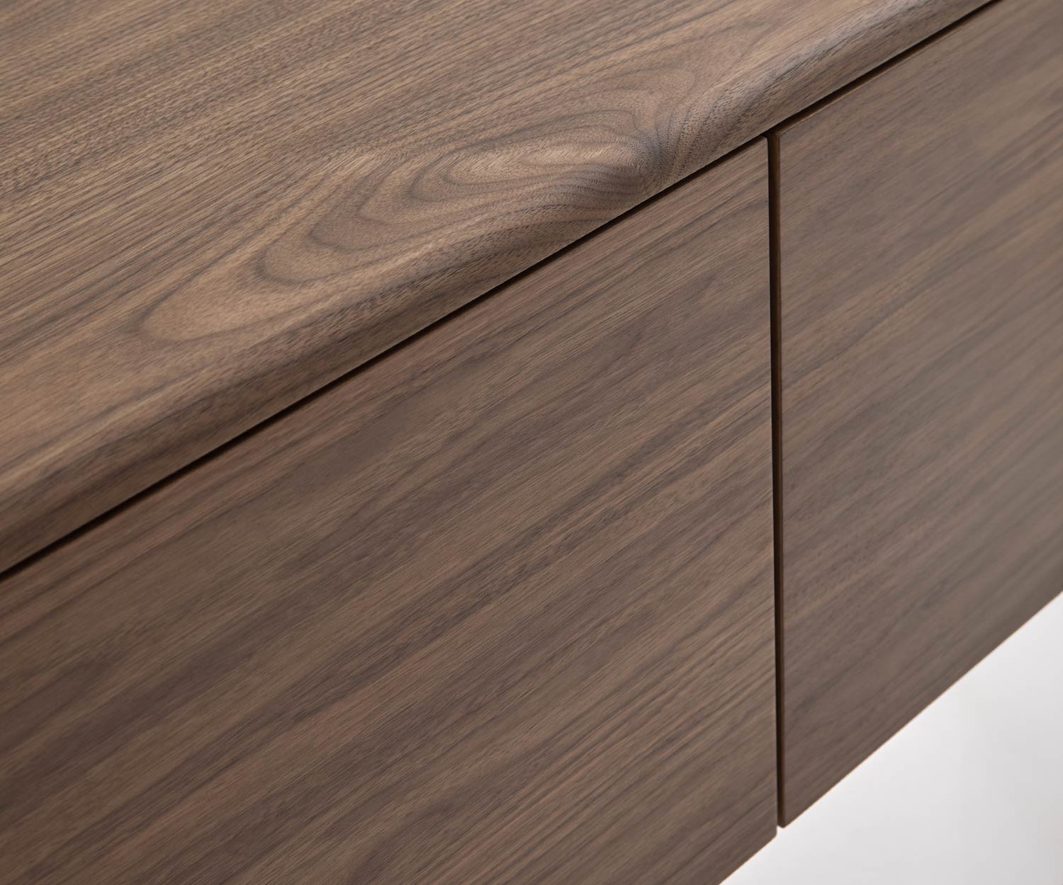 Die verwendeten Furniere gibt es in den Holzfarben Super Matt Eiche, Super Matt Walnuss oder Dunkel gebeizter Eiche. Der Stahlsockel ist in der Farbe Schwarz RAL9005 lackiert.