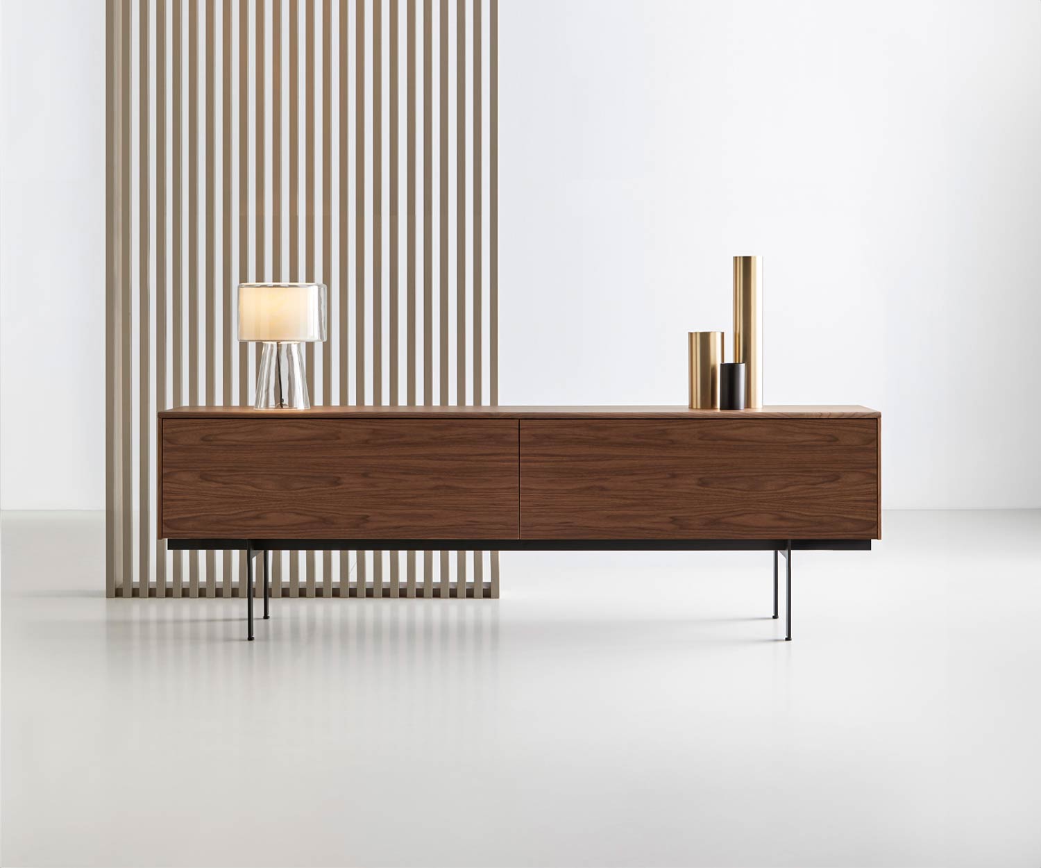 Das Punt Malmö Design Sideboard gehört zu einer namhaften Produktserie, die schwedische Schlichtheit mit spanischem Möbelhandwerk vereint. Dieses von Mario Ruiz kreierte Sideboard verarbeitet gekonnt die verschiedensten hochwertigen Materialien zu einem minimalistischen Meisterwerk für ein anspruchsvolles Esszimmer. Auffällig sind die abgerundeten Vorderkanten über den Klapptüren, die schöne Maserung des Furniers, die optionalen, glänzenden Abdeck- oder Frontplatten und die auffällig schlanken Standbeine bzw. der Sockel.