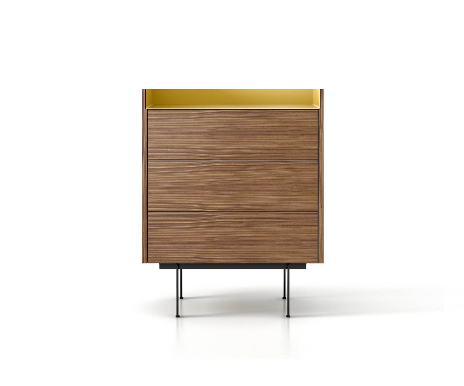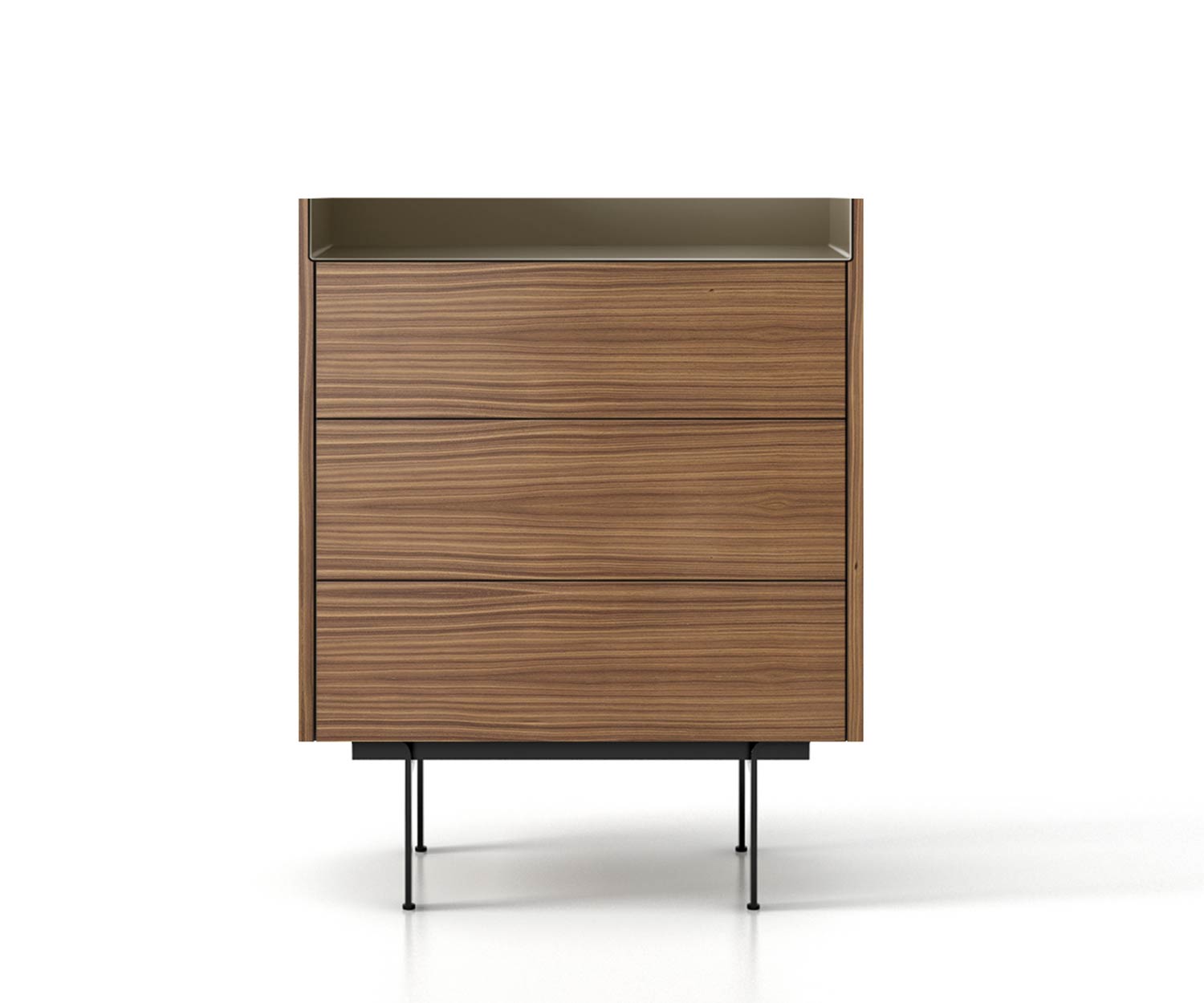 Der Korpus und die Schubladen dieser Design Hochkommode von Punt sind aus MDF-Platten E1 und Spanplatten E1, die mit Eichen- oder Walnuss-Furnier veredelt sind. Es handelt sich dabei um Super Matt Eiche, Super Matt Walnuss oder Dunkel gebeizter Eiche. Das Abdeckplatte on top besteht aus einem hochwertigen anodisierten Aluminium Finish. Der Korpus steht auf einem Stahlsockel mit pulverbeschichteten Füßen.