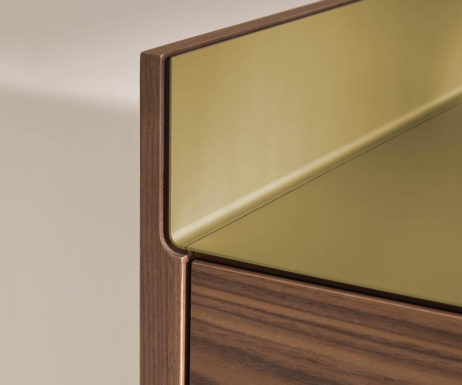 Die Abdeckplatte ist in den Farben Aluminium Gold und Aluminium Bronze erhältlich, Korpus und Front dagegen in Super Matt Eiche, Super Matt Walnuss oder Dunkel gebeizter Eiche (Stained Oak Ebony). Den Stahlsockel gibt es in der Farbe Schwarz RAL9005.
