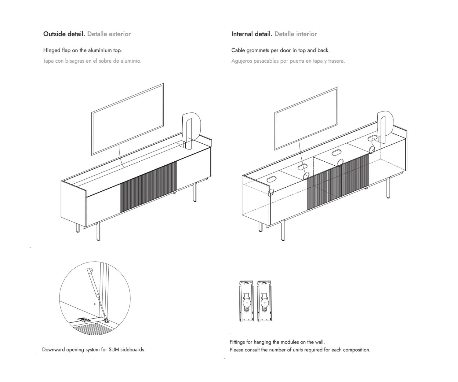 In der Mitte befindet sich unter der Klappe ein Zugang zum Innenraum, der das Verbinden von Geräten im Lowboard mit dem Fernseher darauf zulässt. Zwei Kabeldurchlässe in der Rückwand ermöglichen eine einfache Stromzufuhr in das Möbelstück.