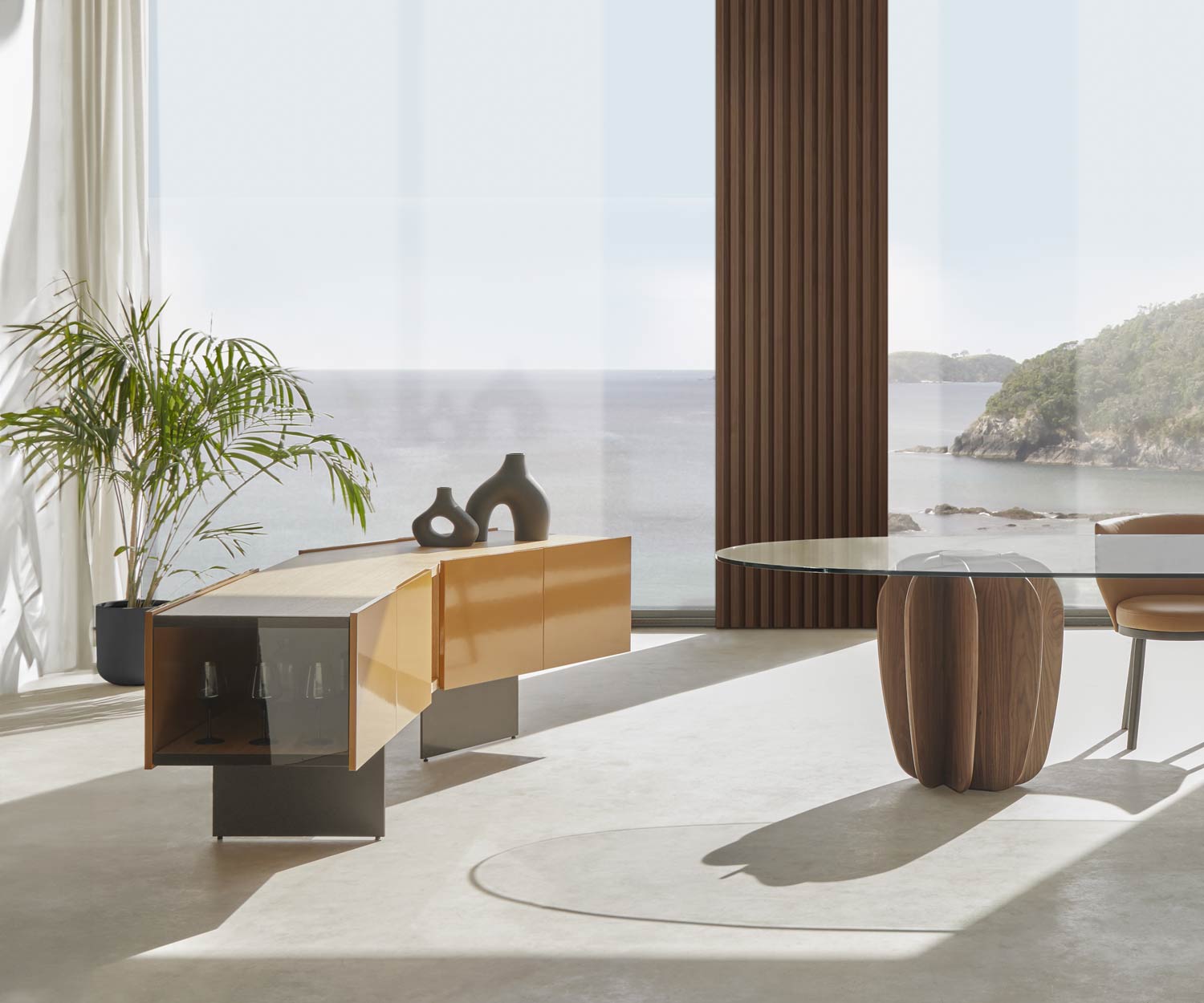 Das Besondere beim Punt Toscana Firenze Sideboard ist sein Knick in einem stumpfen Winkel. Dadurch lässt dieses Design das Möbel immer in den Raum hineinragen und bringt es vom klassischen Wandplatz näher an das Zentrum mit Esstisch und Stühlen.