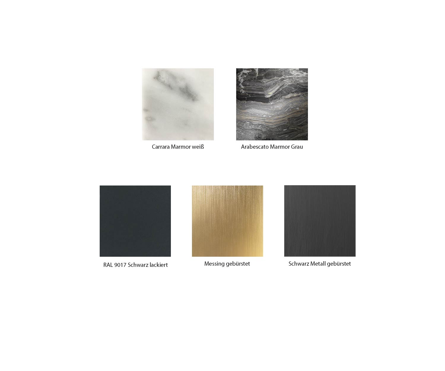 Die Marmorplatte des Wave Couchtisches ist in 2 Ausführungen erhältlich: Carrara Marmor Weiß oder Arabescato Marmor Grau erhältlich. Das Metallgestell ist wahlweise in Messing gebürstet oder Schwarz Metall gebürstet erhältlich. Für Ihren Marmortisch bieten wir Ihnen zwei verschiedene Versiegelungen an: Einmal eine X-Stone-Versiegelung und dann ein Polyester Coating.