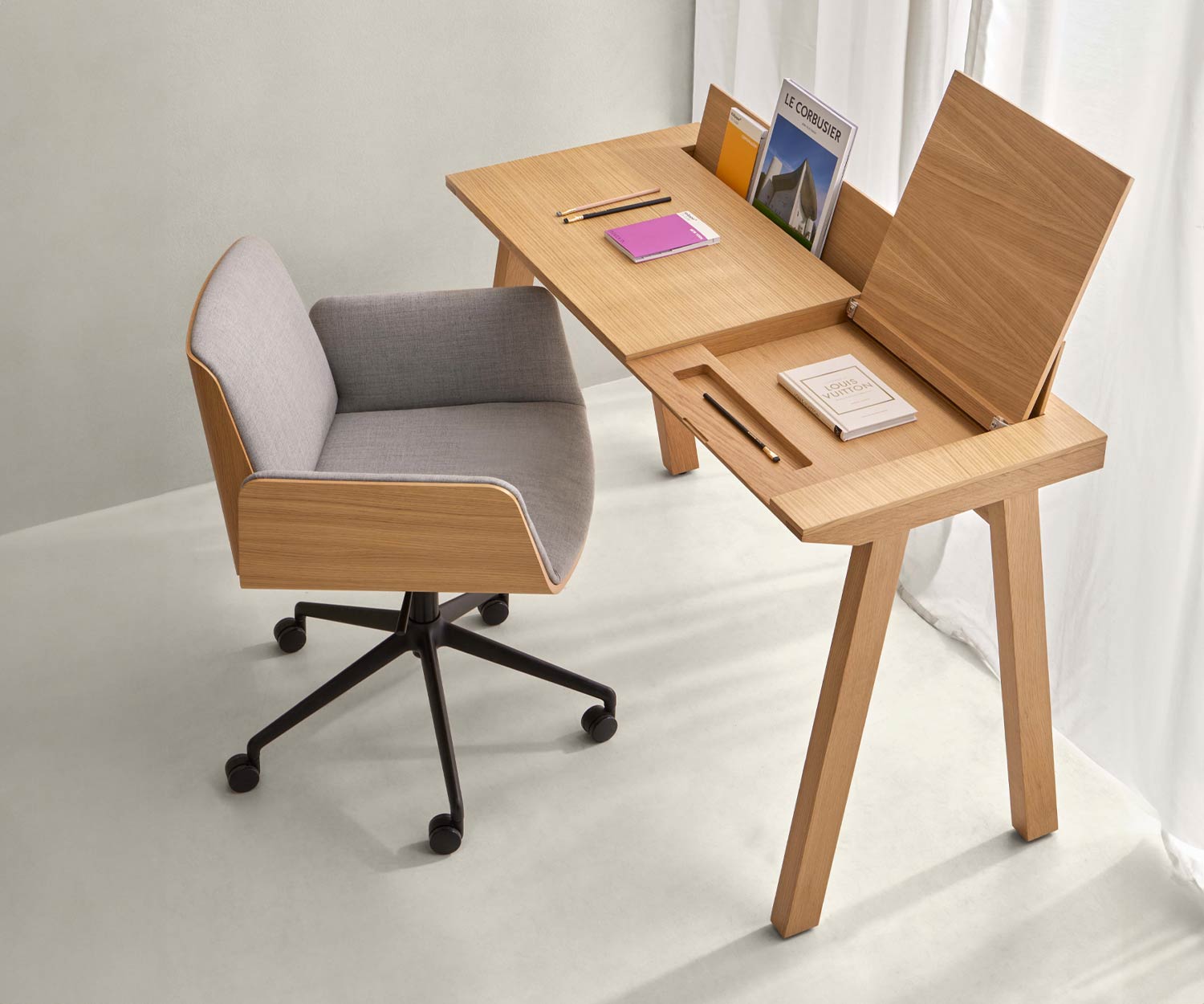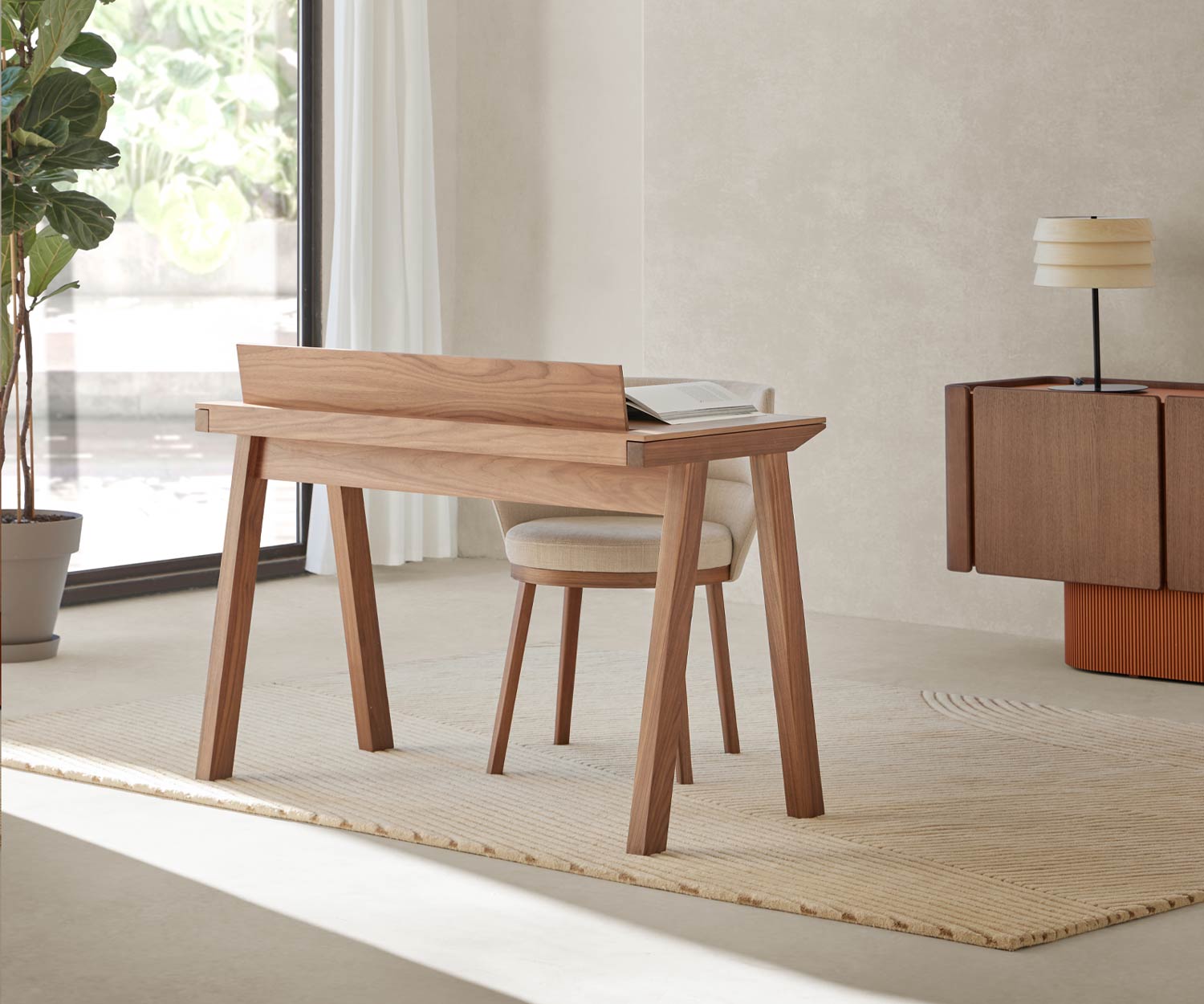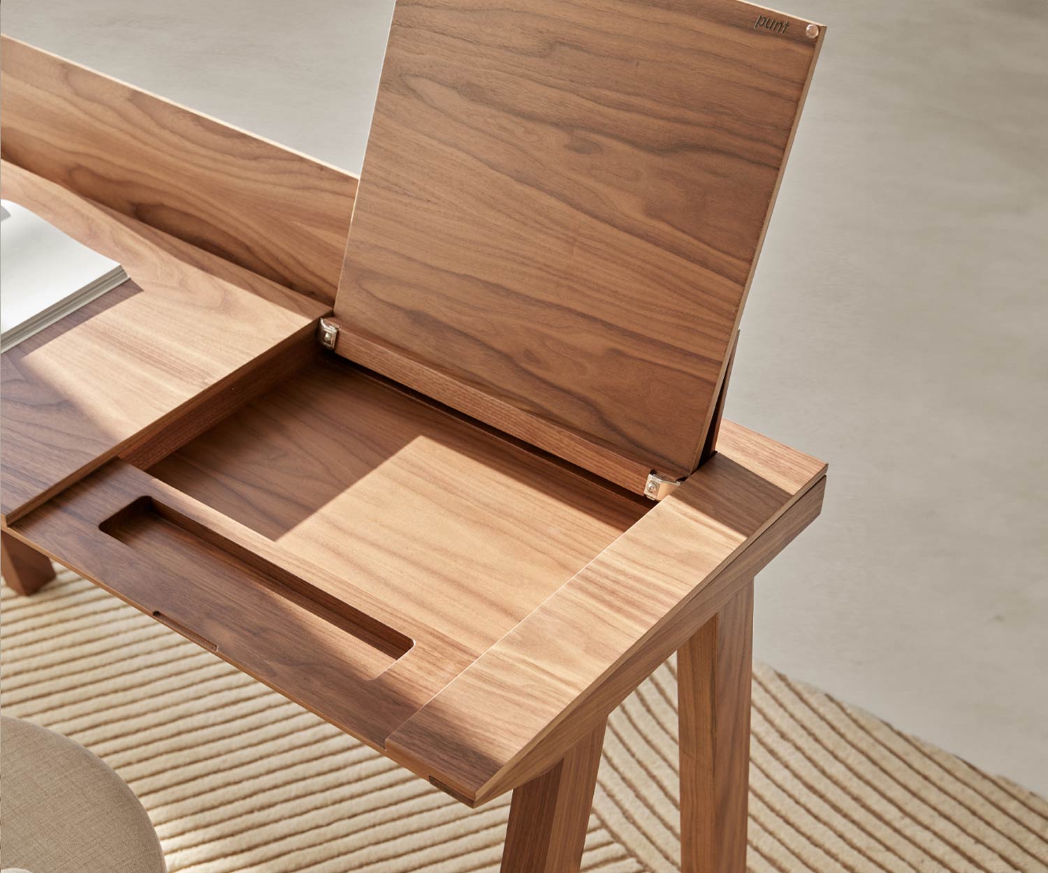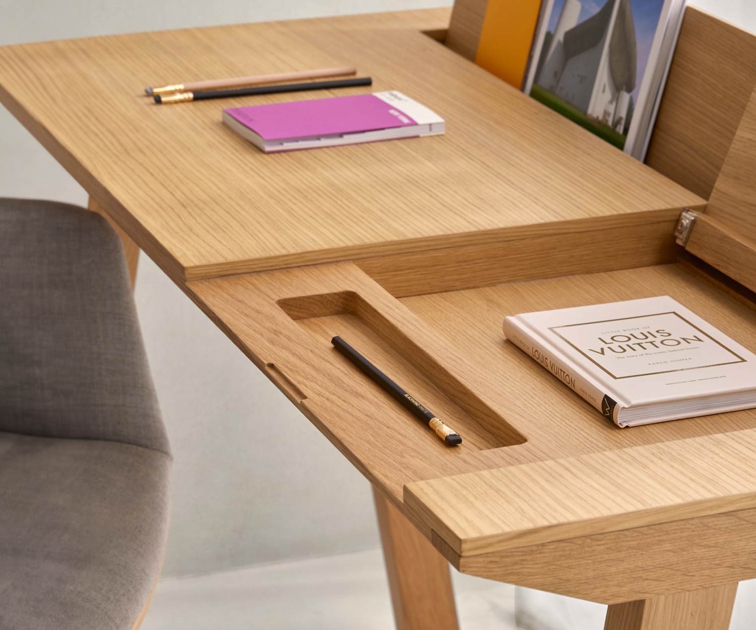 Einzigartiger Design Sekretär Ernest von Punt aus Spanien. Das moderne Design sorgt für einen zeitlosen Auftritt und lässt den Schreibtisch in jedem Raum problemlos integrieren. Das Gestell ist in massiver Eiche oder Walnuss gefertigt. Die Tischplatte hat ein verstecktes Fach für kleine Utensilien. An der Rückseite befindet sich ein praktischer Ständer, der für Tablets, Dokumente oder Noten genutzt werden kann. Ein integriertes Kabel-Management sorgt für eine unsichtbare Kabelführung vom Bein bis zur Tischplatte.