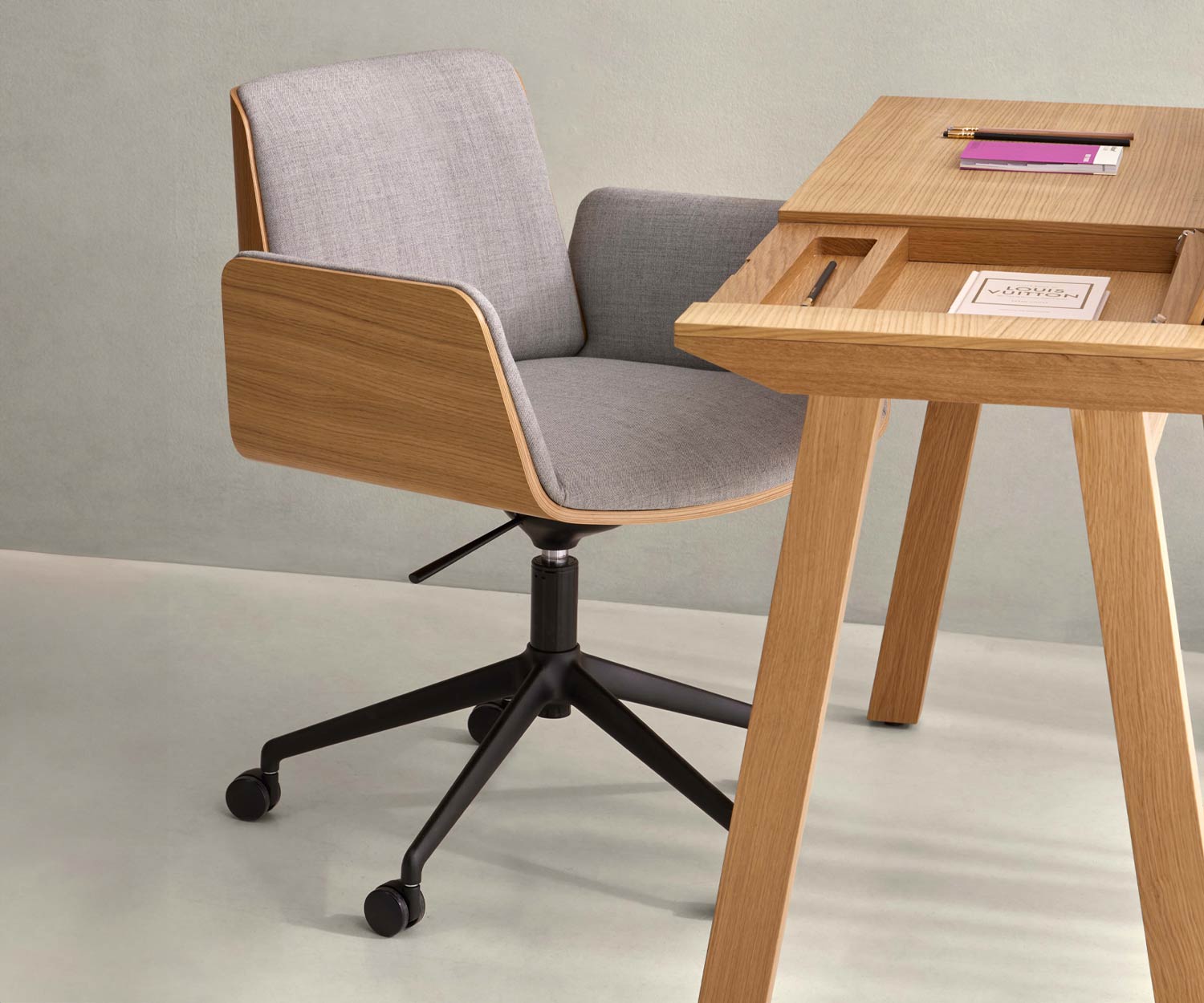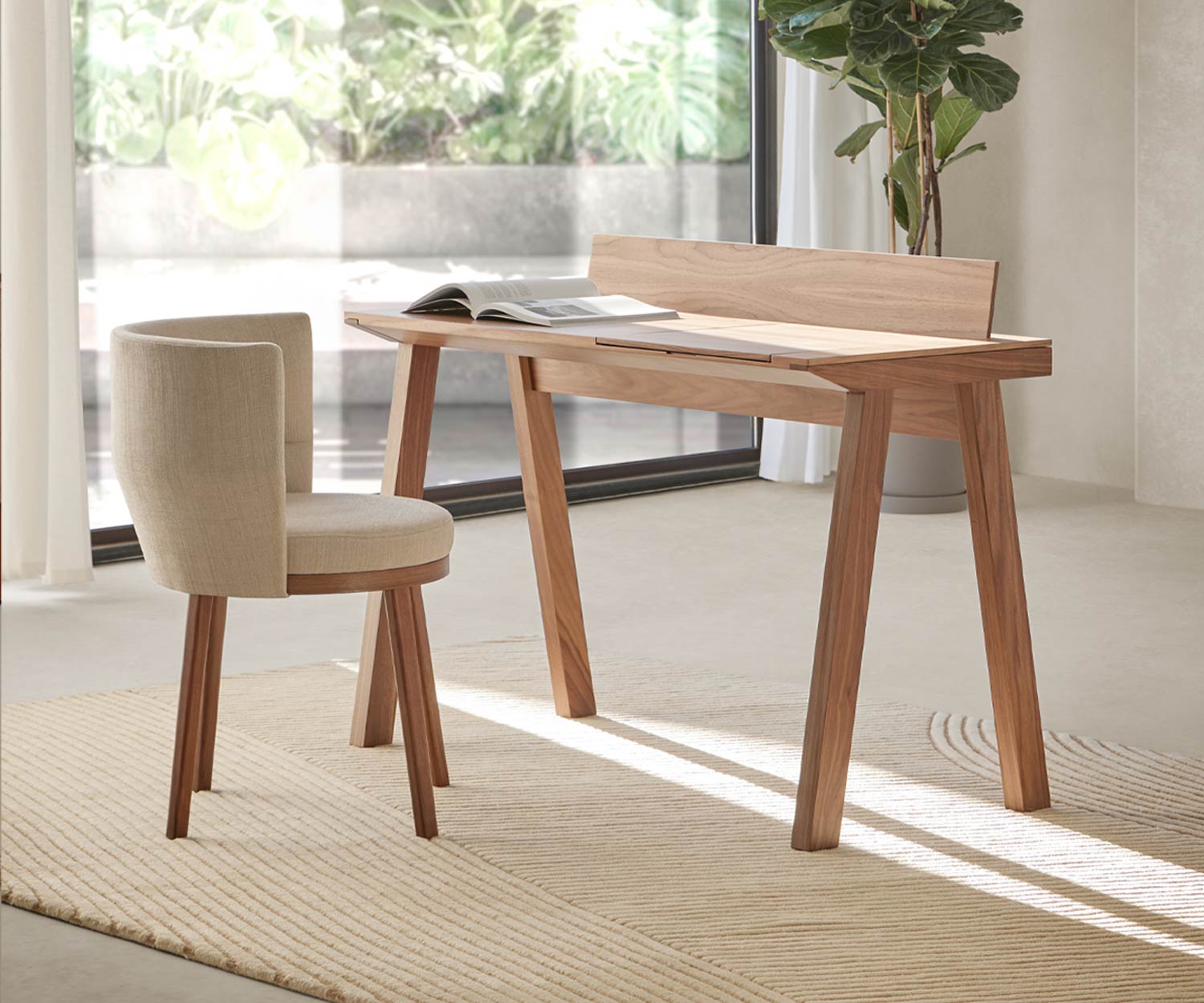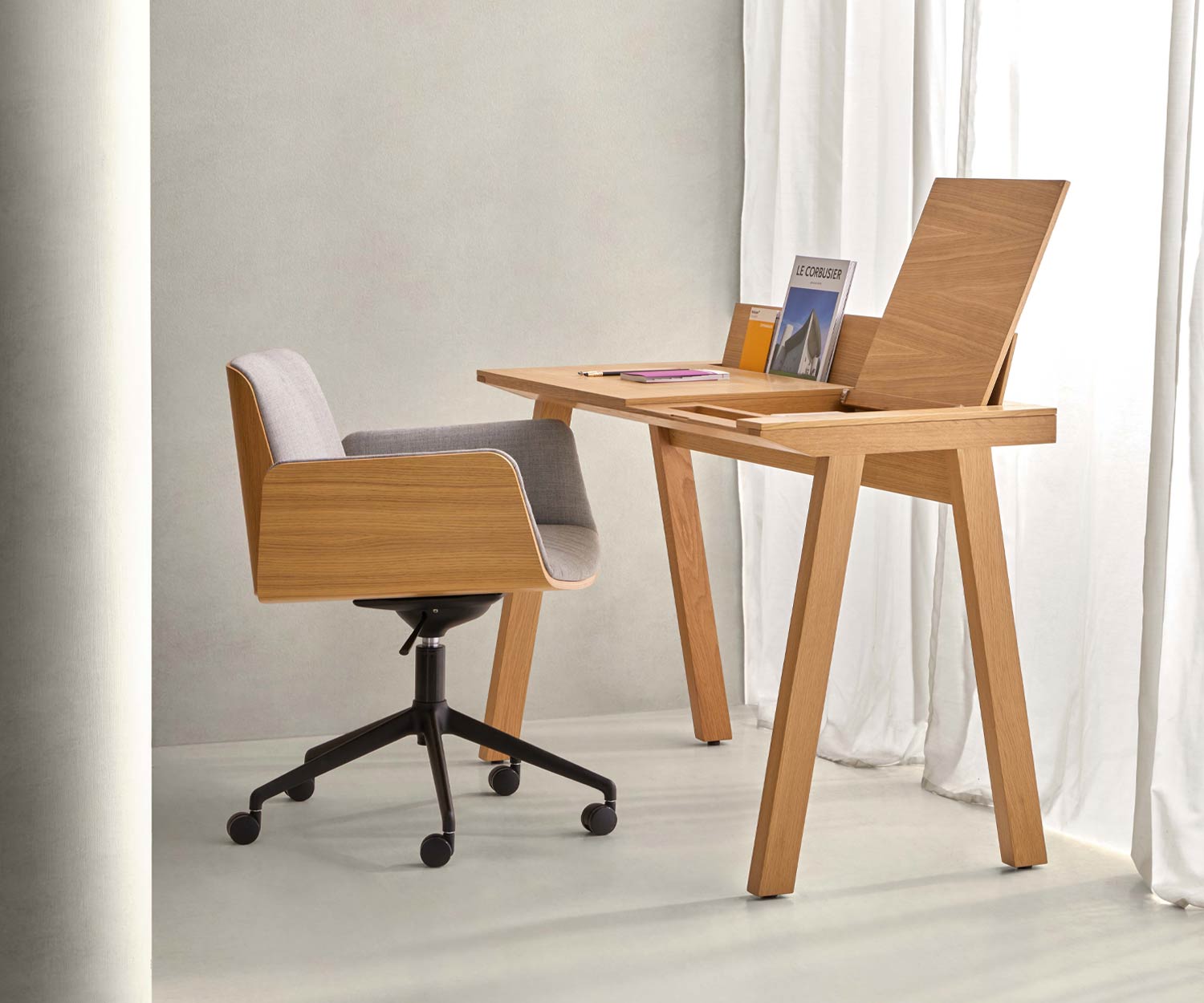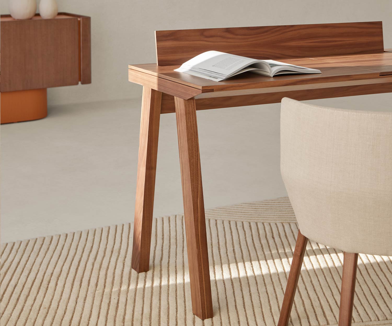 Einzigartiger Design Sekretär Ernest von Punt aus Spanien. Das moderne Design sorgt für einen zeitlosen Auftritt und lässt den Schreibtisch in jedem Raum problemlos integrieren. Das Gestell ist in massiver Eiche oder Walnuss gefertigt. Die Tischplatte hat ein verstecktes Fach für kleine Utensilien. An der Rückseite befindet sich ein praktischer Ständer, der für Tablets, Dokumente oder Noten genutzt werden kann. Ein integriertes Kabel-Management sorgt für eine unsichtbare Kabelführung vom Bein bis zur Tischplatte.